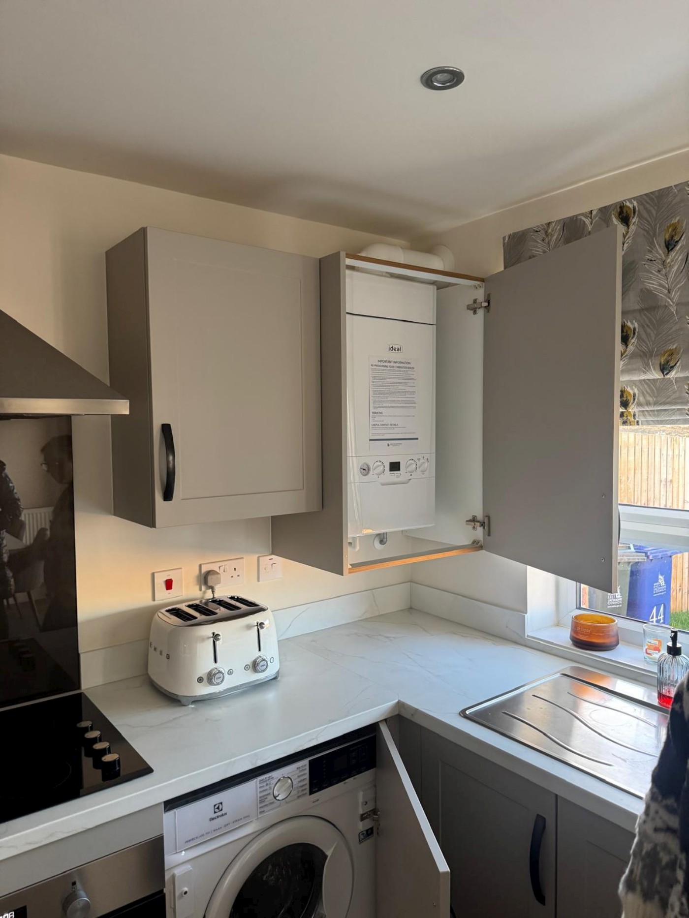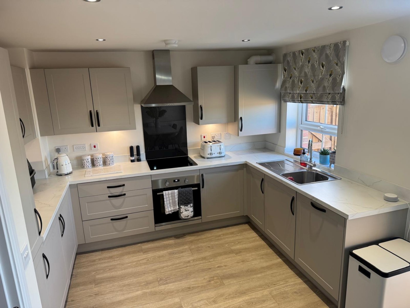 Modern fitted kitchen/diner with garden access